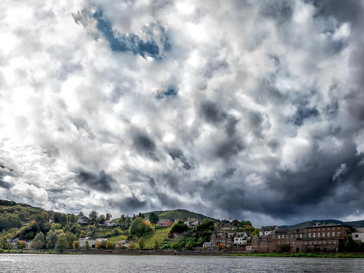 An einem warmen, aber wolkigen Sommertag machte ich mich auf, um die Terrassenmosel zu besuchen. Zu dieser zählt man auch den Ort Alf. Gegenüber von Alf befindet sich der Nachbarort Bullay. Gegen Mittag traf ich dort ein und begab mich zum Ufer der Mosel. Von dort eröffnete sich mir dieser großartige Blick auf den steilen Alfer Weinberg: Der Steilhang „Hölle“ unter einem Meer von hellen und dunklen Wolken.
