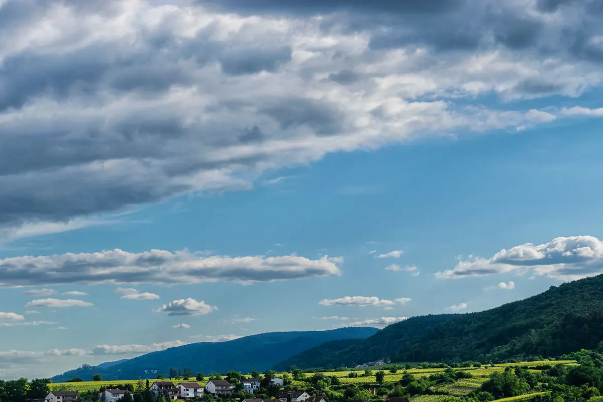 An diesem herrlichen Sommertag fuhren wir entlang der deutschen Weinstraße durch das Weinanbaugebiet der Pfalz. Dort konnte man erkennen, wie Wolken, Hügel, Weinberge und der Ort Deidesheim als eine Weinlandschaften harmonierten.