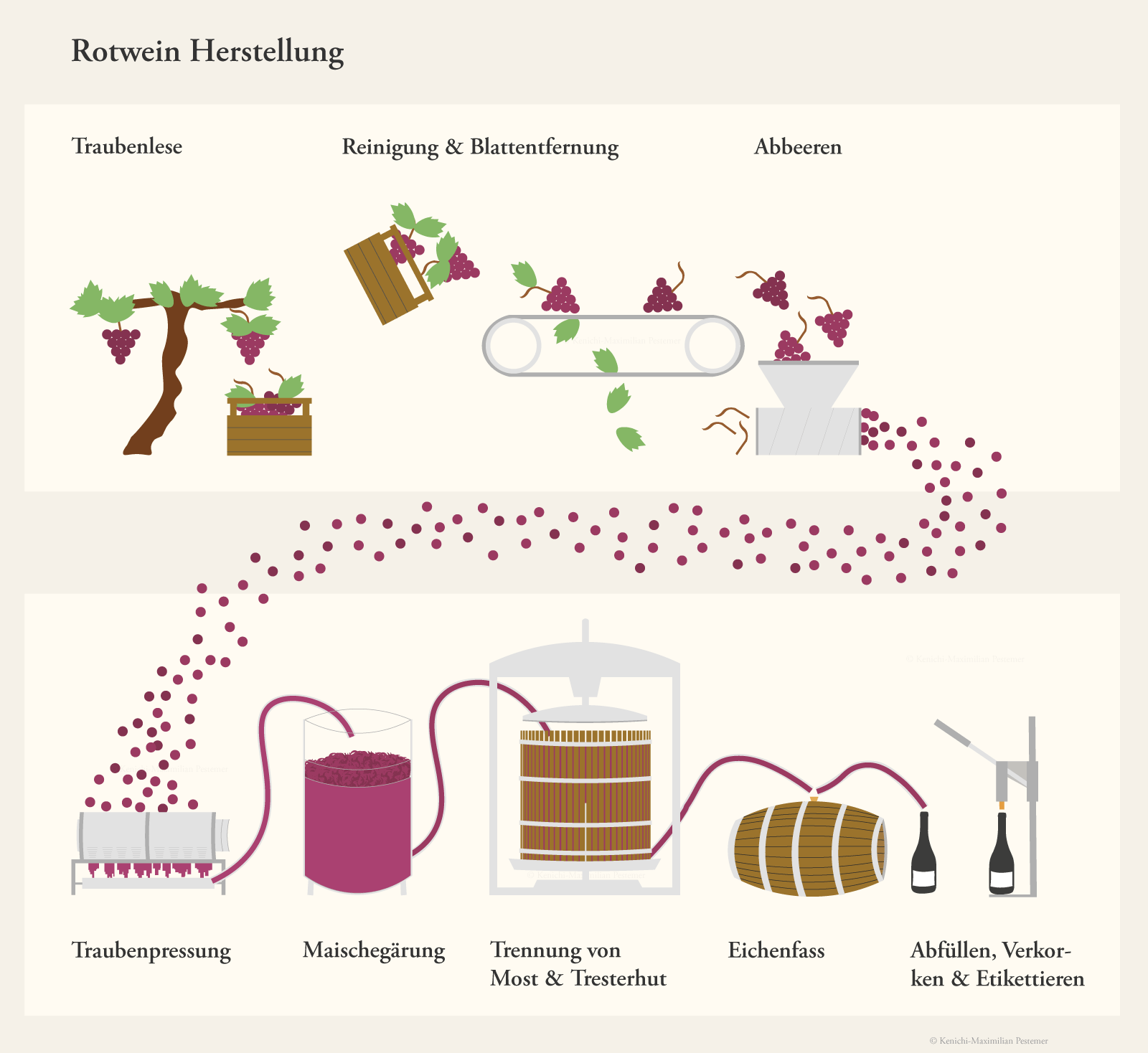 In der nachfolgenden Grafik wird die Rotwein-Herstellung grafisch veranschaulicht. Je nach Land, Weinregion, Ort und Winzer kann der Prozess durchaus etwas variieren. In Georgien würde ein Winzer statt dem Eichenfass z.B. eine Quevri, als ein in der Erde vergrabener Tonkrug, verwenden.